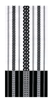 四角形の四隅を凹ませた「隅入り角」を繋ぎ合わせて、連続的に並べて縞模様にした文様です。