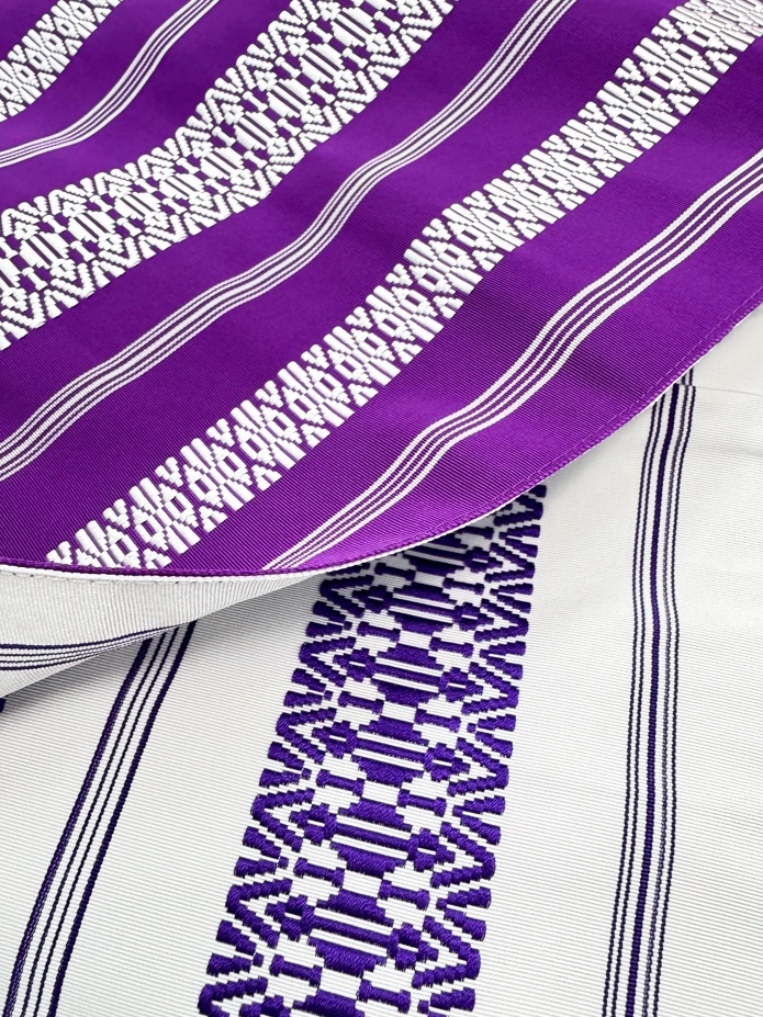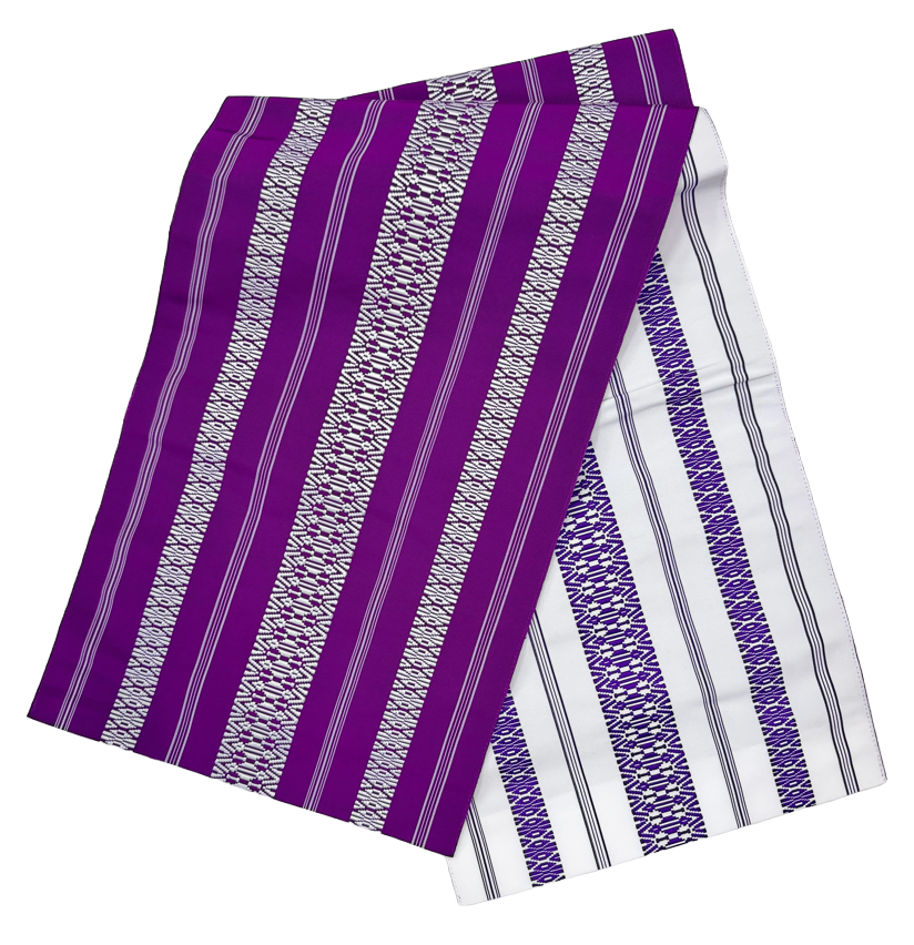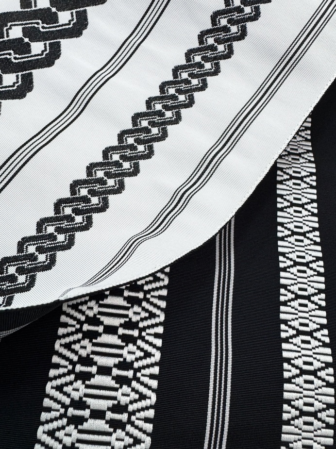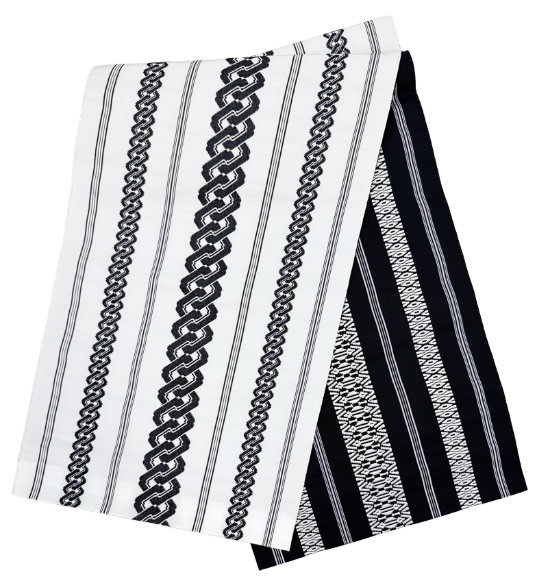 仏具の独鈷(どっこ)と華皿(はなざら)をモチーフに作られ、間には親子縞や孝行縞を配した文様です。