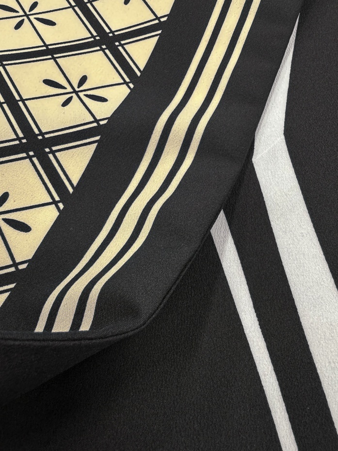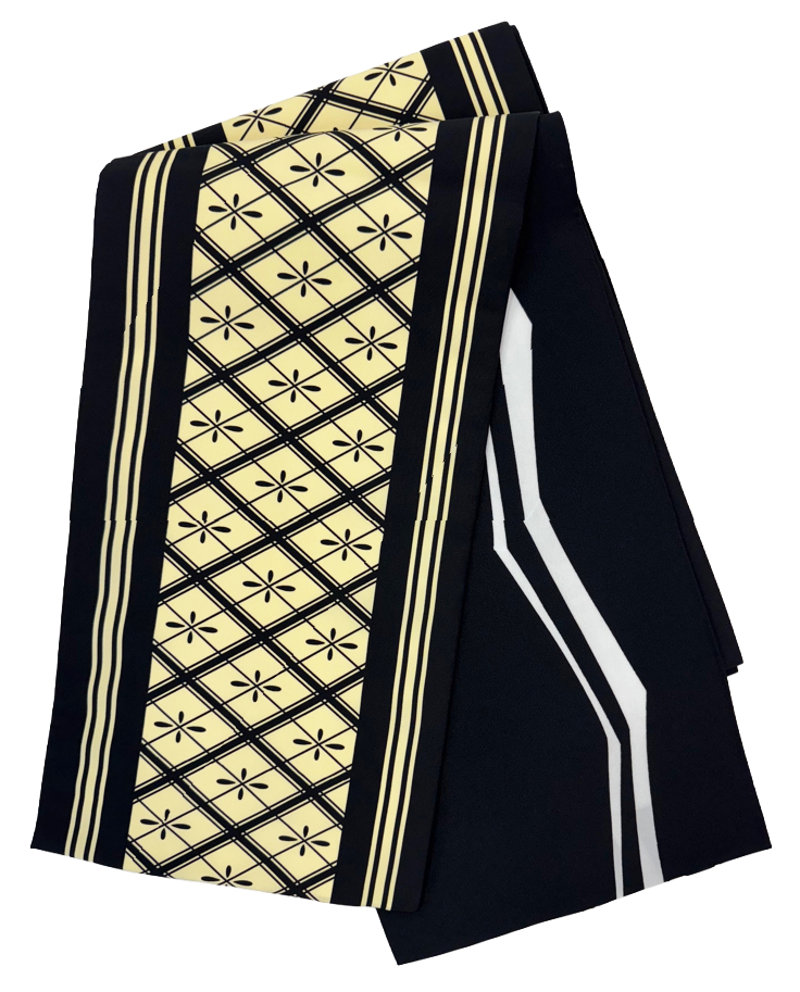仏具の独鈷(どっこ)と華皿(はなざら)をモチーフに作られ、間には親子縞や孝行縞を配した文様です。