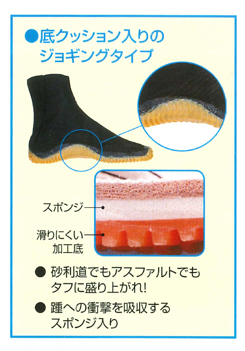 かかとへの衝撃を吸収するスポンジ入りの、底クッション入りのジョギングタイプ
